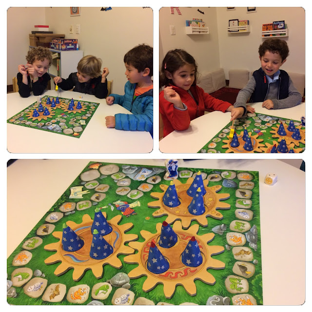 Neste jogo, todos movimentam o grande "wizard", Merlin, pelo tabuleiro. O tabuleiro possui 3 engrenagens. Em cada engrenagem colocamos 3 chapéus. E embaixo de cada chapéu uma ficha com a imagem de um animal (cat, raven, dragon, owl, bat, frog). Os jogadores podem ver onde cada animal foi colocado pois depois terão que utilizar sua memória para localizar os animais...O caminho por onde Merlin irá andar possui uma imagem de animal em cada "casa". Um de cada vez joga o dado e movimenta Merlin. E então é preciso encontrar o animal correspondente à "casa" em que Merlin está. O jogador então precisa se lembrar onde aquele animal se encontra. Com a varinha mágica (que possui um imã na ponta) o jogador deverá falar o feitiço (simplificamos o feitiço que está nas regras dos jogo para facilitar): "Frog's tongue, spider's legs, I see a ______(name of the animal) under the hat". E então, utilizar a sua "magic wand" para levantar o chapéu escolhido. Se a imagem sob o chapéu for a correta aquele jogador ganha uma estrela (estrela = ponto). Desta vez porém jogamos como um time. Então cada estrela que o jogador ganhava era para todo o time (e nosso objetivo era conseguir 10 pontos). No dado, além de números temos tb um símbolo. Ao jogar o dado e tirar este símbolo deve-se girar as engrenagens (o que dificulta a localização dos animais pois as 3 engrenagem giram, mudando tudo de posição).