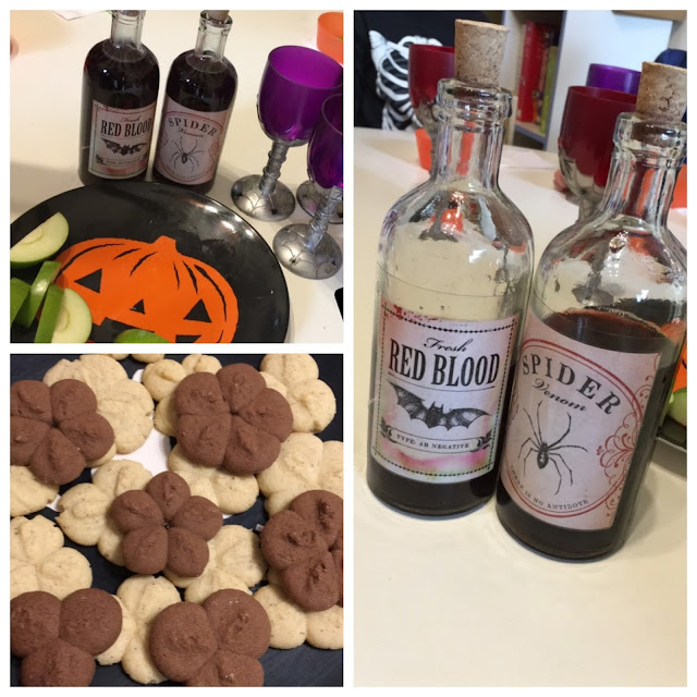 O nosso lanche neste dia de festa tb foi especial! Além de frutas (que sempre temos), tivemos deliciosos cookies caseiros (spritz cookies) e para beber "bat blood" ou "spider venom" (ambos eram suco de uva integral).